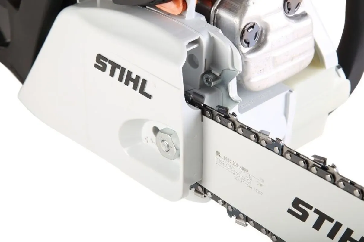 - Гальмо ланцюга QuickStop спрацьовує при натисканні на передній захист рук або у разі сильної віддачі та за лічені частки секунди зупиняє пильний ланцюг;