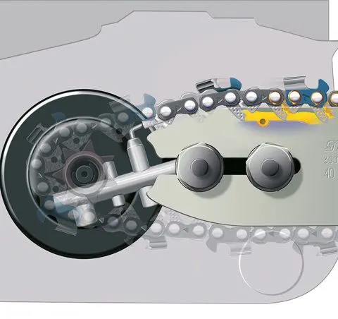 - Гальмування ланцюга QuickStop спрацьовує в разі натискання на передній захист рук або в разі сильного удару і за лічені частки секунди зупиняє пиляльний ланцюг;