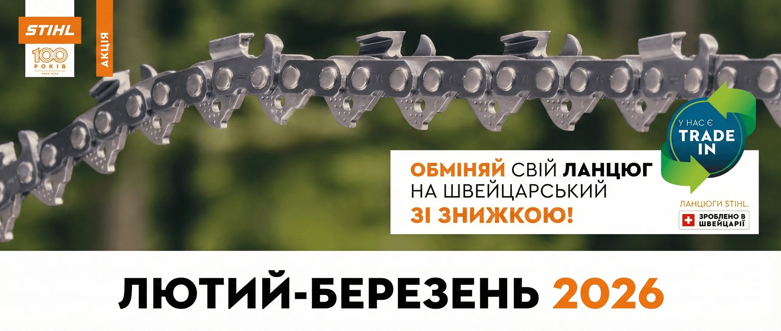 Цієї весни ми допомагаємо вашому інструменту працювати на повну потужність. Лише у лютому та березні 2026 року приносьте свій відпрацьований ланцюг будь-якого бренду та отримуйте гарантовану знижку на новий оригінальний ланцюг STIHL, виготовлений у Швейцарії.