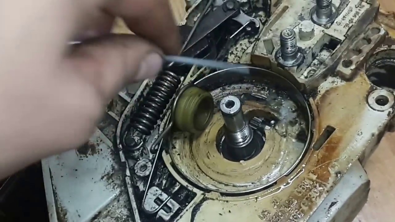 - Проверка подачи масла. Снимите цепь и шину, запустите двигатель на холостом ходу. Если вещество поступает из отверстия — насос работает. Если нет — ищите причину глубже.