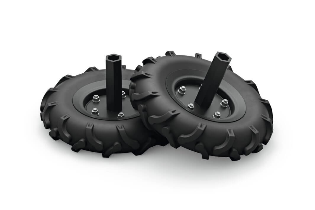 Колеса легко устанавливаются на ось культиватора, превращая его в маневренное транспортное средство для перевозки к месту работы или хранения.